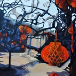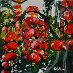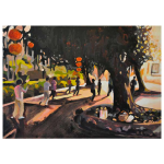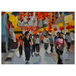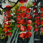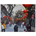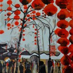 Je voulais depuis longtemps « peindre la Chine », celle que je visite maintenant régulièrement et qui continue de me surprendre à chaque voyage. Cette série de toiles représente des moments de tous les jours, des scènes de rue, des parcs animés, des temples en enfilade. Les atmosphères aux couleurs tantôt criardes tantôt très grises et brumeuses, sont peuplées de vie, d’énergie et l’espace est égayé par les lanternes rouges omniprésentes qui appellent à la fête.